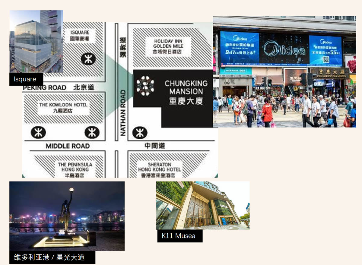 重庆大厦LED屏幕位于尖沙咀人车流最繁忙的路口,屏幕正对北京路的红绿灯路口。周边商场,地标及酒店林立,是香港最有代表性的CBD。 大型商场:Isquare,K11 Musea,北京道一号 酒店:半岛酒店,喜来登酒店,朗廷酒店,瑰丽酒店 旅游地标:维多利亚港,星光大道,1881 Heritage,天星码头,文化中心,钟楼